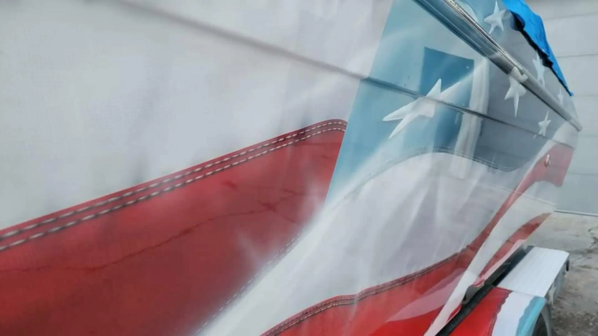 The boat was sent to the legendary TAOD paint shop where Dean Loucks applied an absolutely stunning American flag paint job, with such incredible detail that it looks like it was stitched onto the boat. There are over 10,000 individual stitches painted on each side of the boat, and the detail on the individual stars looks like they are embroidered. And they didn’t stop at the chine of the boat with the graphics. The MYCO trailer continues the stars and stripes theme as well. This paint-job is truly breath-taking!