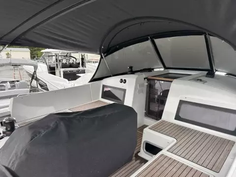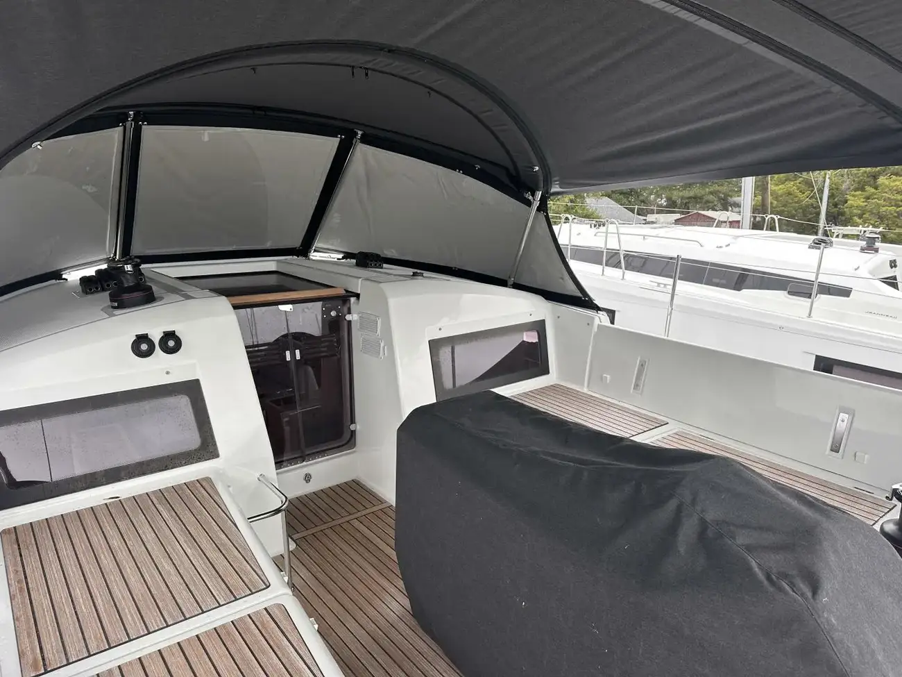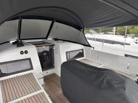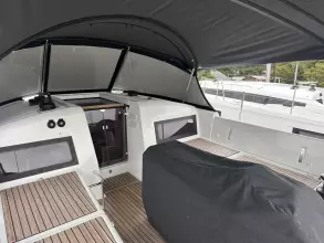- Includes a bow thruster, GRP bowsprit with anchor gear, electric windlass, additional freshwater tank, cockpit table, lifeline gates, shades/screens for hatches and ports, and elegant wood inserts in hull ports