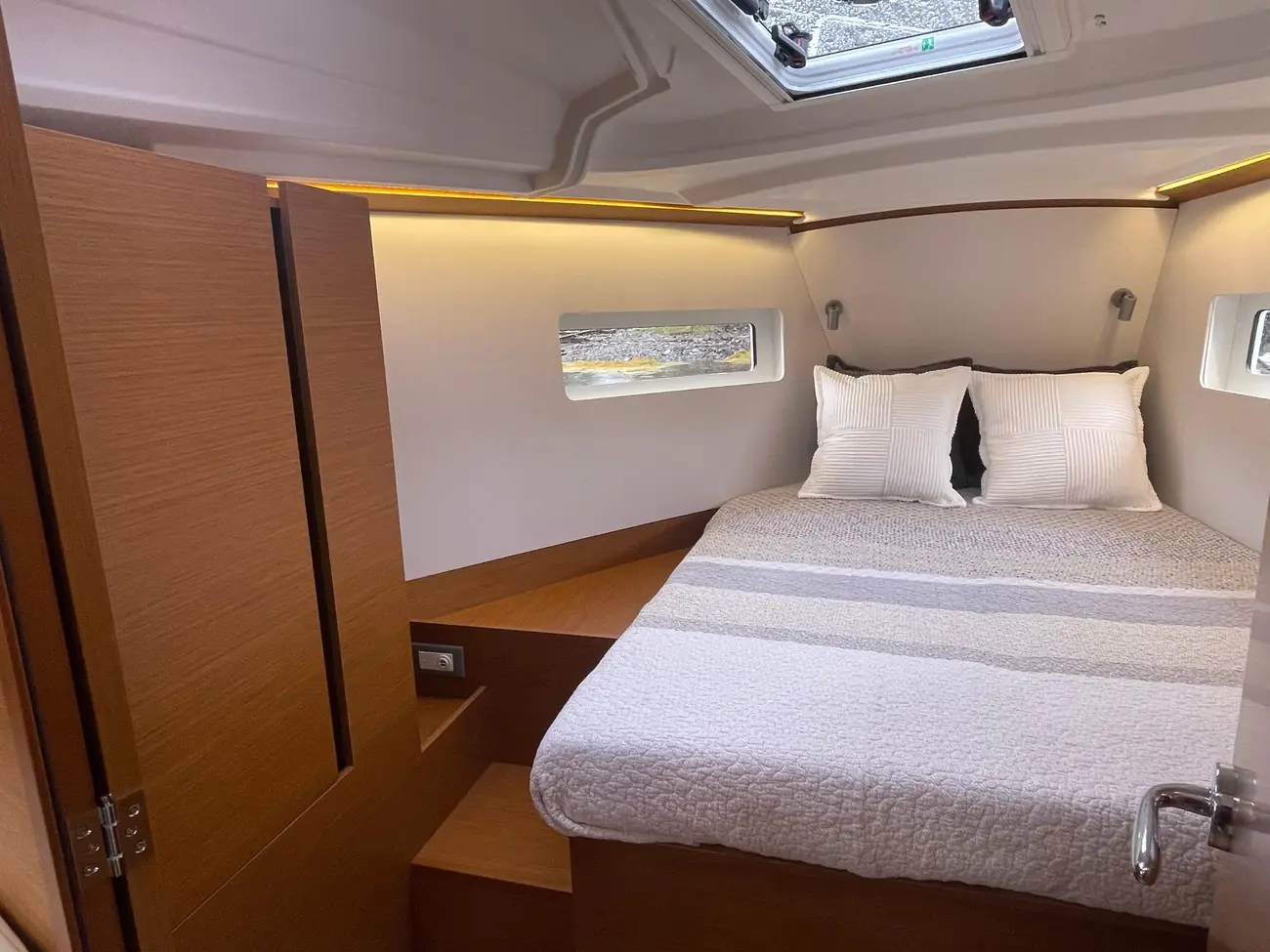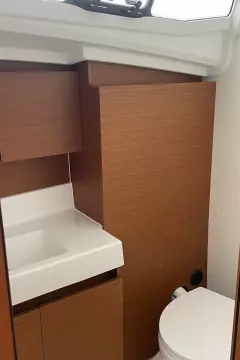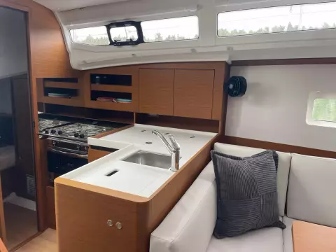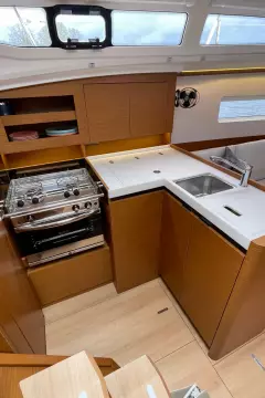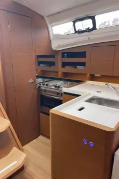 Below deck, the Sun Odyssey 380 boasts a stylish and functional interior. Ours offers a teak two stateroom, one head layout. The main saloon is bathed in natural light, with large hull windows that create a bright and airy ambiance. High-quality materials and fine craftsmanship are evident throughout, offering both luxury and practicality. With ample storage, a well-appointed galley, and comfortable cabins, the Jeanneau Sun Odyssey 380 is well-suited for extended cruises, making it an ideal choice for those seeking adventure and relaxation on the water.