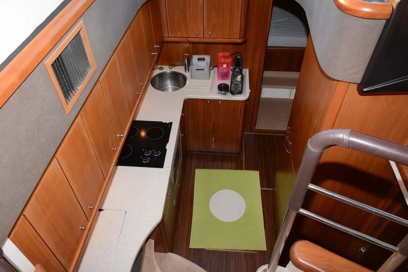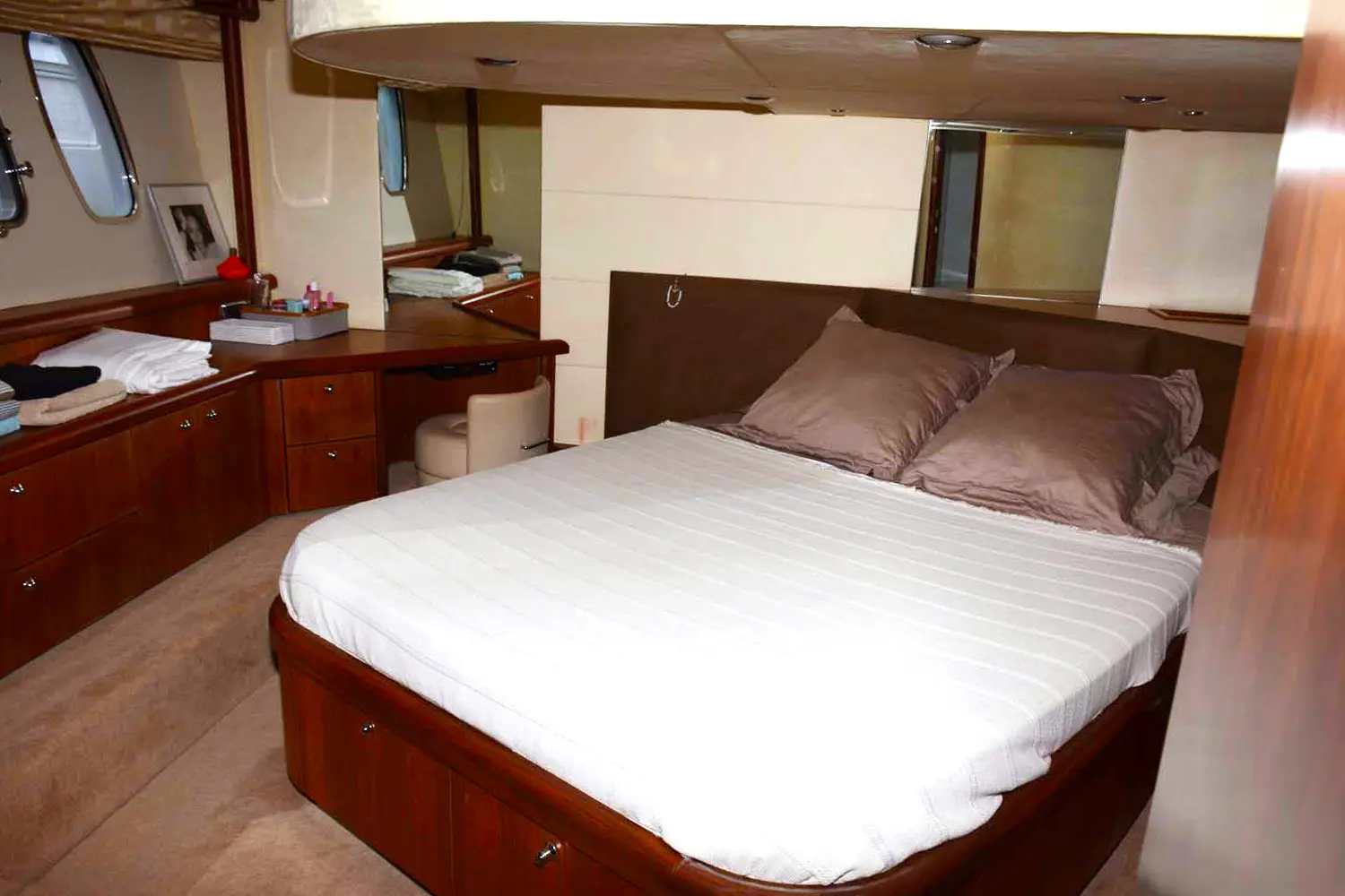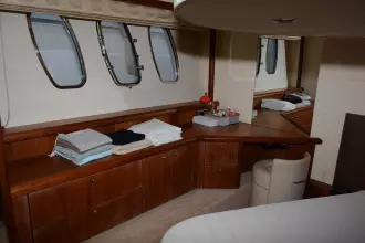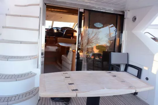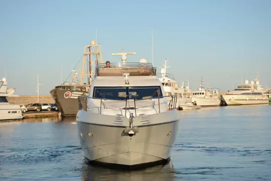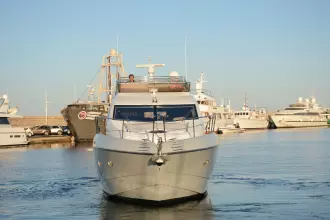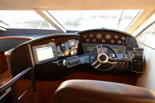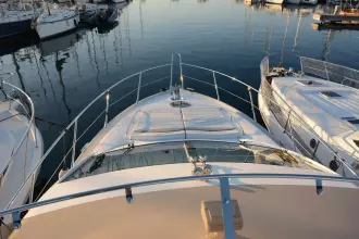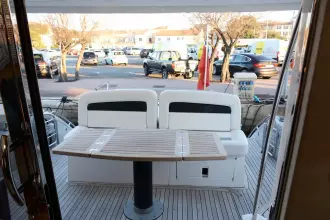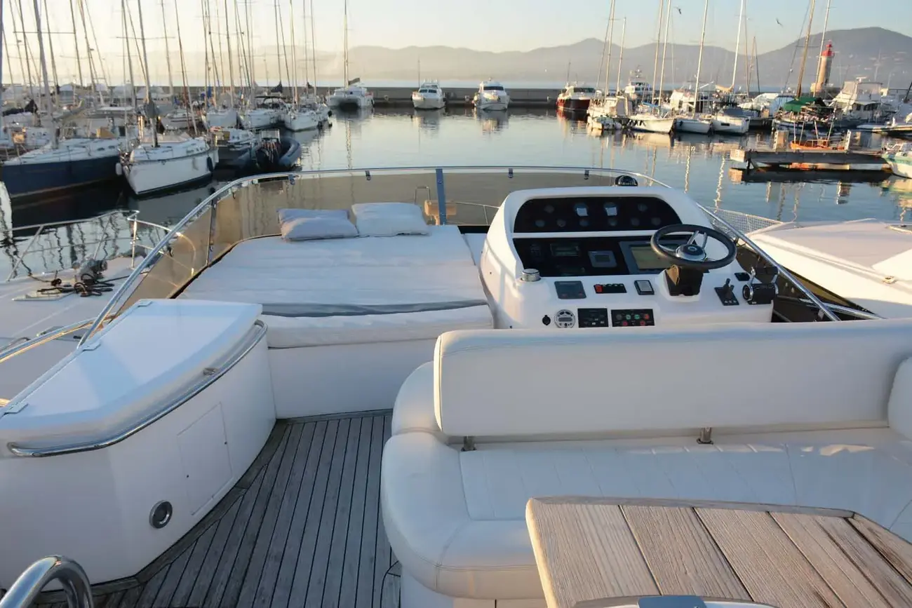 Its spacious flybridge is ideal for enjoying time at sea, with a comfortable lounging area and an ergonomic helm station. Inside, the bright and inviting salon, fully equipped galley, and three cabins—plus a separate crew cabin—offer optimal comfort for all on board.