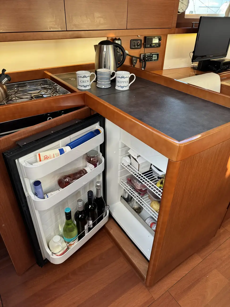 Galley: Well equipped with gas oven and hob, microwave, fridge, and freezer