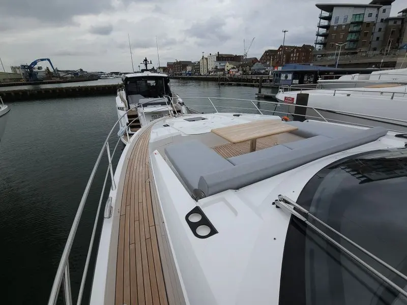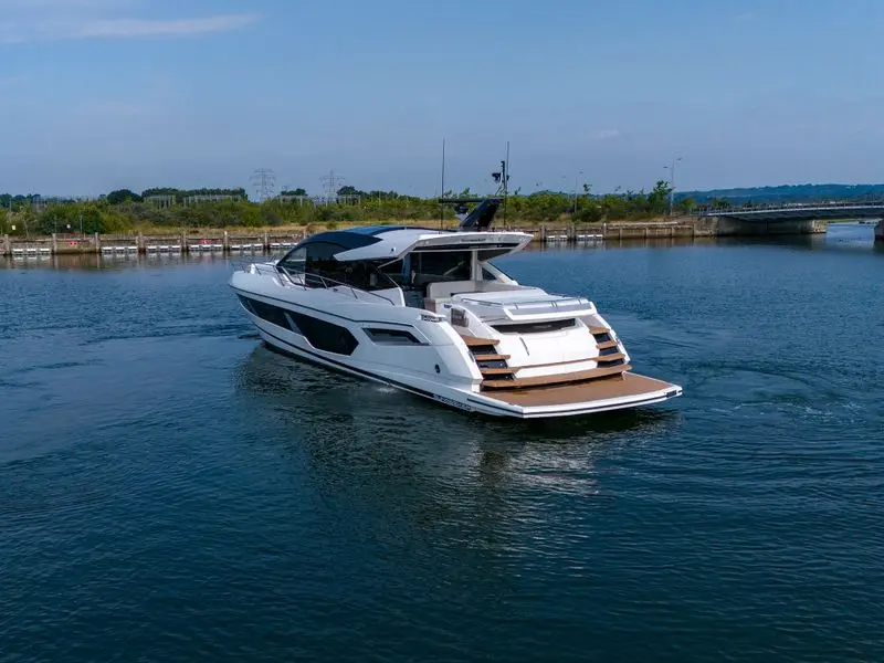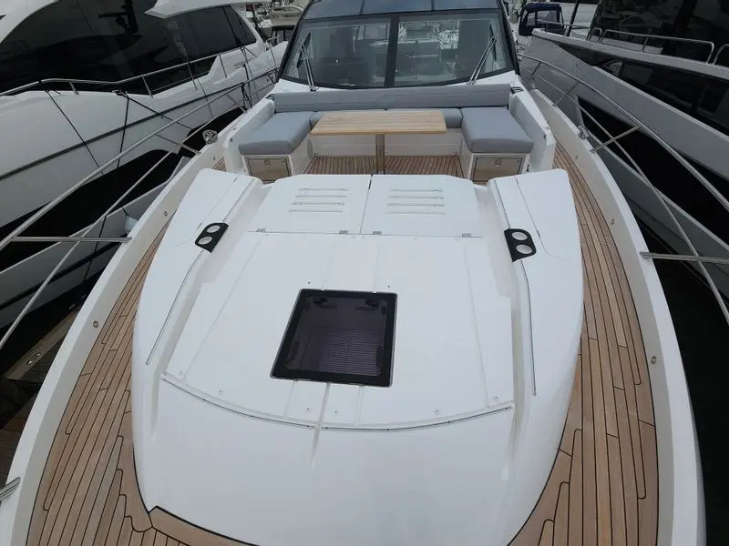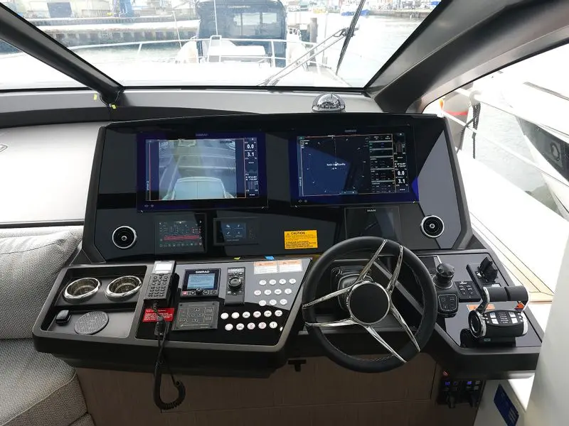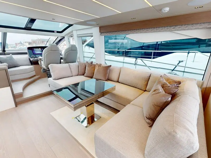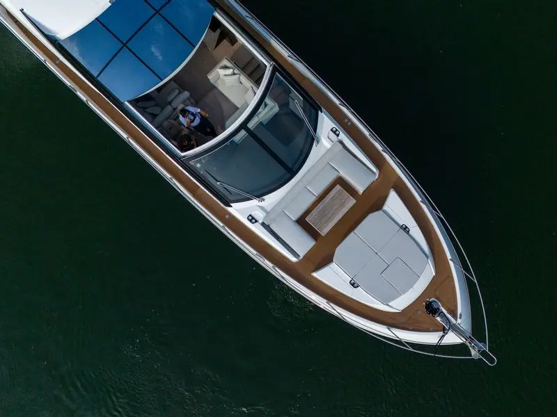 Aesthetic styling is prevalent in every detail. The yacht profile turns heads with stainless steel air intake cowlings and exterior handrails, contributing to the high-quality finish. There is an enhanced material selection, with new exterior upholstery and moulding options. Adventurous buyers will be captivated by a choice of four new grey hull colours. Overall, the exterior is aggressive and imposing, with a new, angular hull and superstructure glazing design.