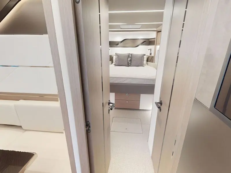 The lower deck arrangement offers spacious accommodation for up to six guests and two crew.A sumptuous full-beam master cabin has a dressing table fitted with storage, a chaise longue and plenty of additional wardrobe space.