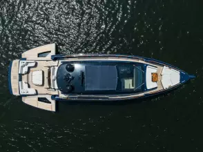 The helm station, located on the main deck, features modern MFDs and Böning screens for comprehensive boat information. The Aras electric helm seats are multi-adjustable, ensuring comfort for the captain and co-pilot. In addition to the main helm station, there is a docking station on the port aft deck quarter.