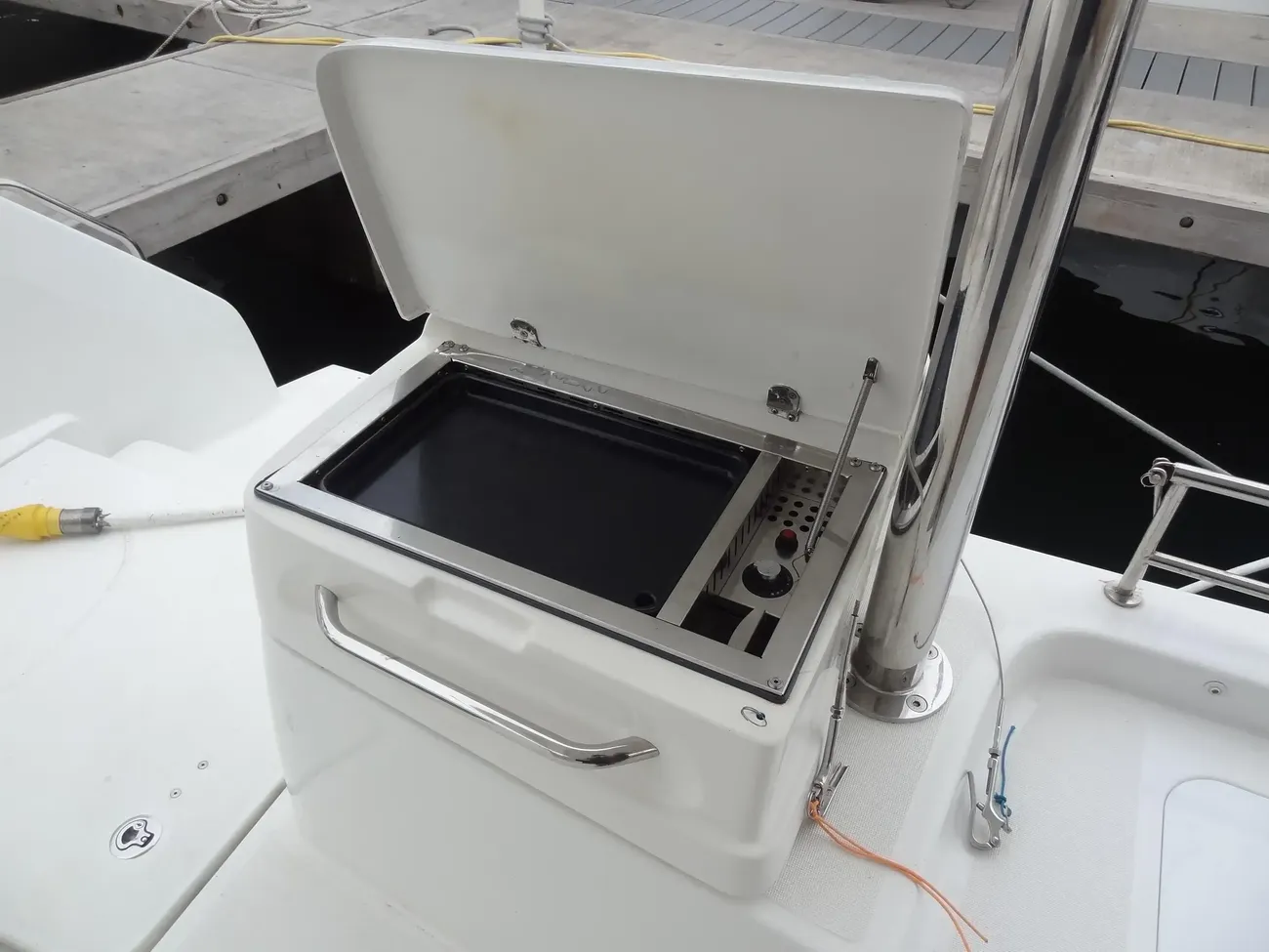 A large open cockpit facing out to sea, large stern skirts enable easy access to the boat and a large modular dining area with removable bench seats to welcome children and adults alike.