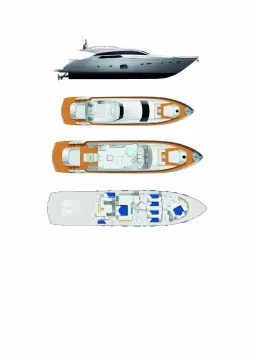 She has a very generous main deck. Separating the salon from the aft deck is an electrical sliding glass door that lowers completely into the floor. The discreet sun deck located on the upper deck offers a large lounging area with: