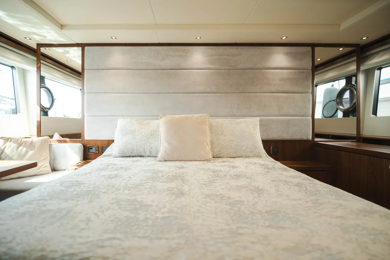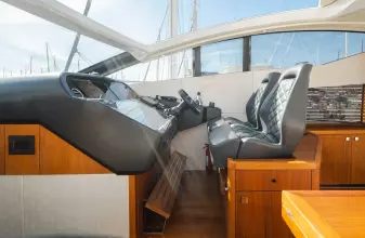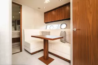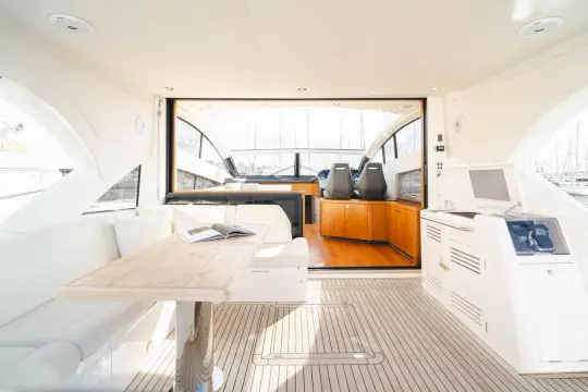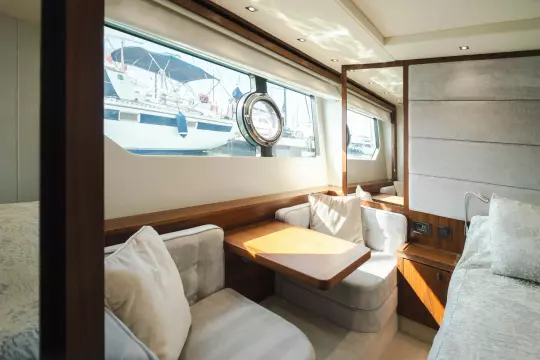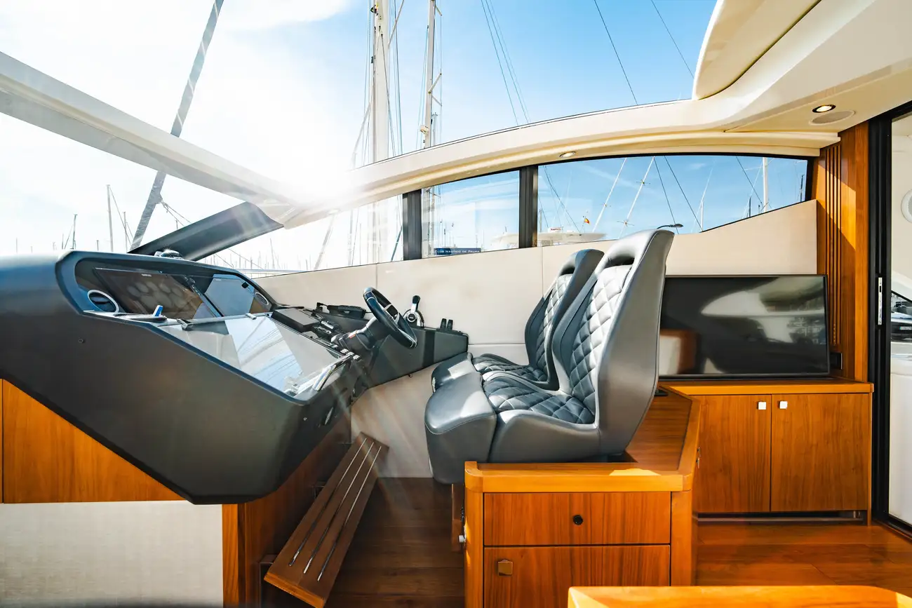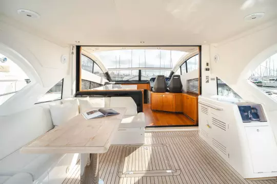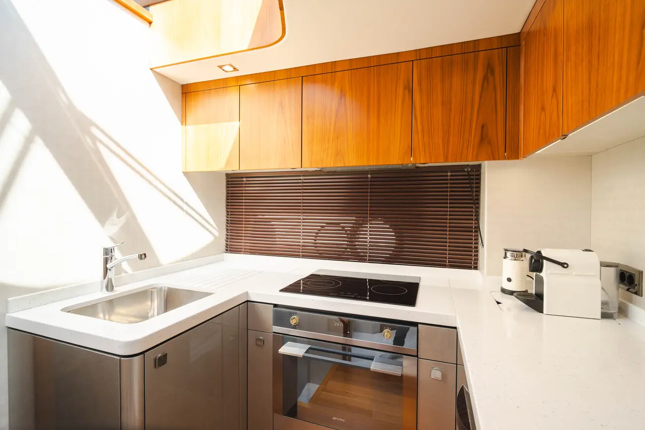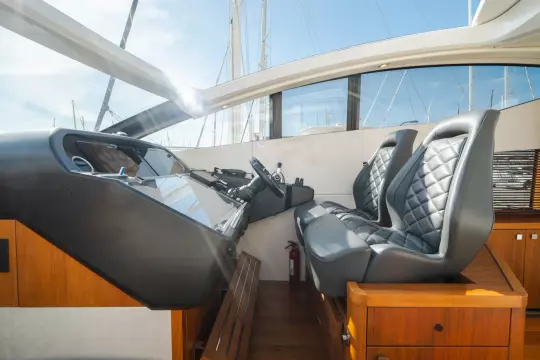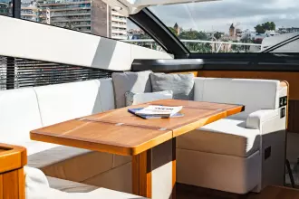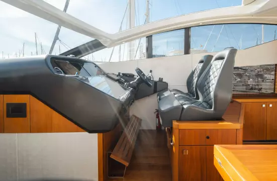 Inside, a light-filled saloon blends with the cockpit thanks to the retractable doors and open hardtop. Below deck, three stylish cabins sleep six guests comfortably, including a spacious full-beam master suite. The fully equipped galley and entertainment systems ensure comfort on every journey.