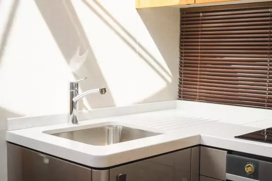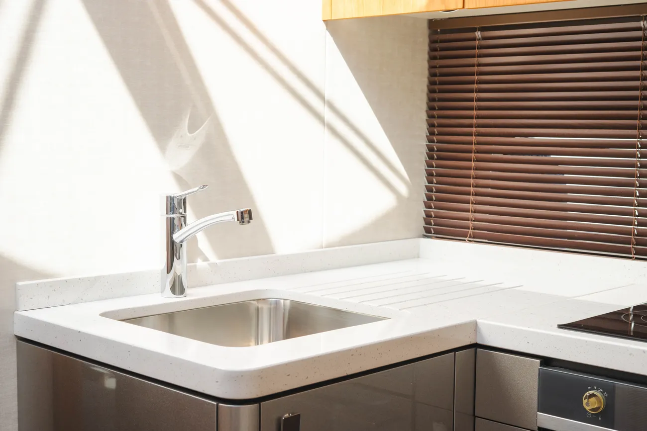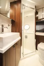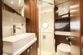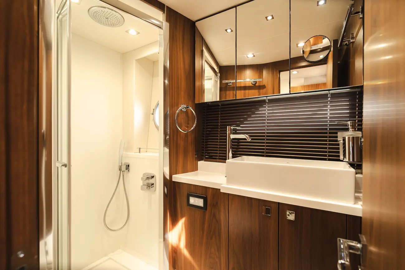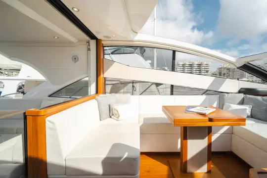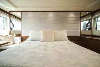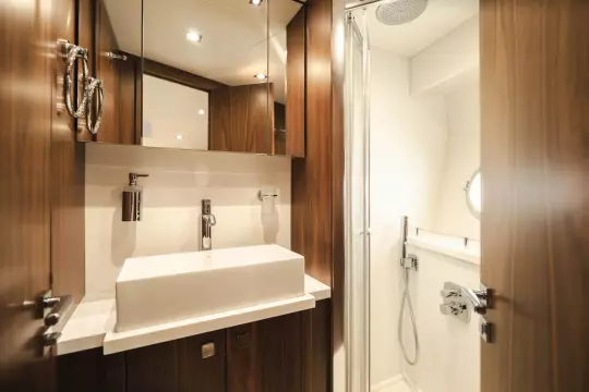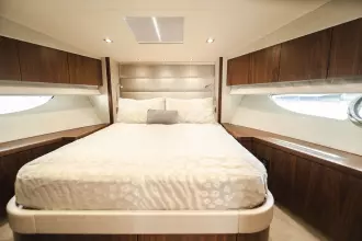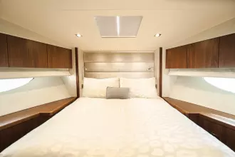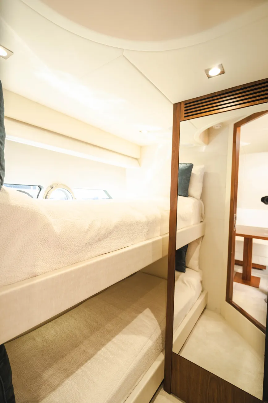 Inside, a light-filled saloon blends with the cockpit thanks to the retractable doors and open hardtop. Below deck, three stylish cabins sleep six guests comfortably, including a spacious full-beam master suite. The fully equipped galley and entertainment systems ensure comfort on every journey.