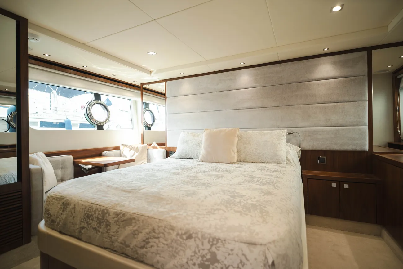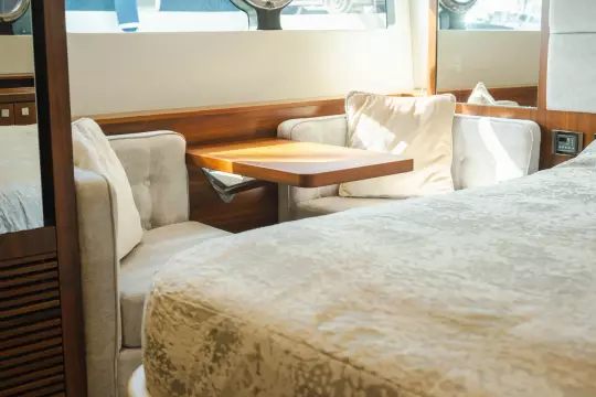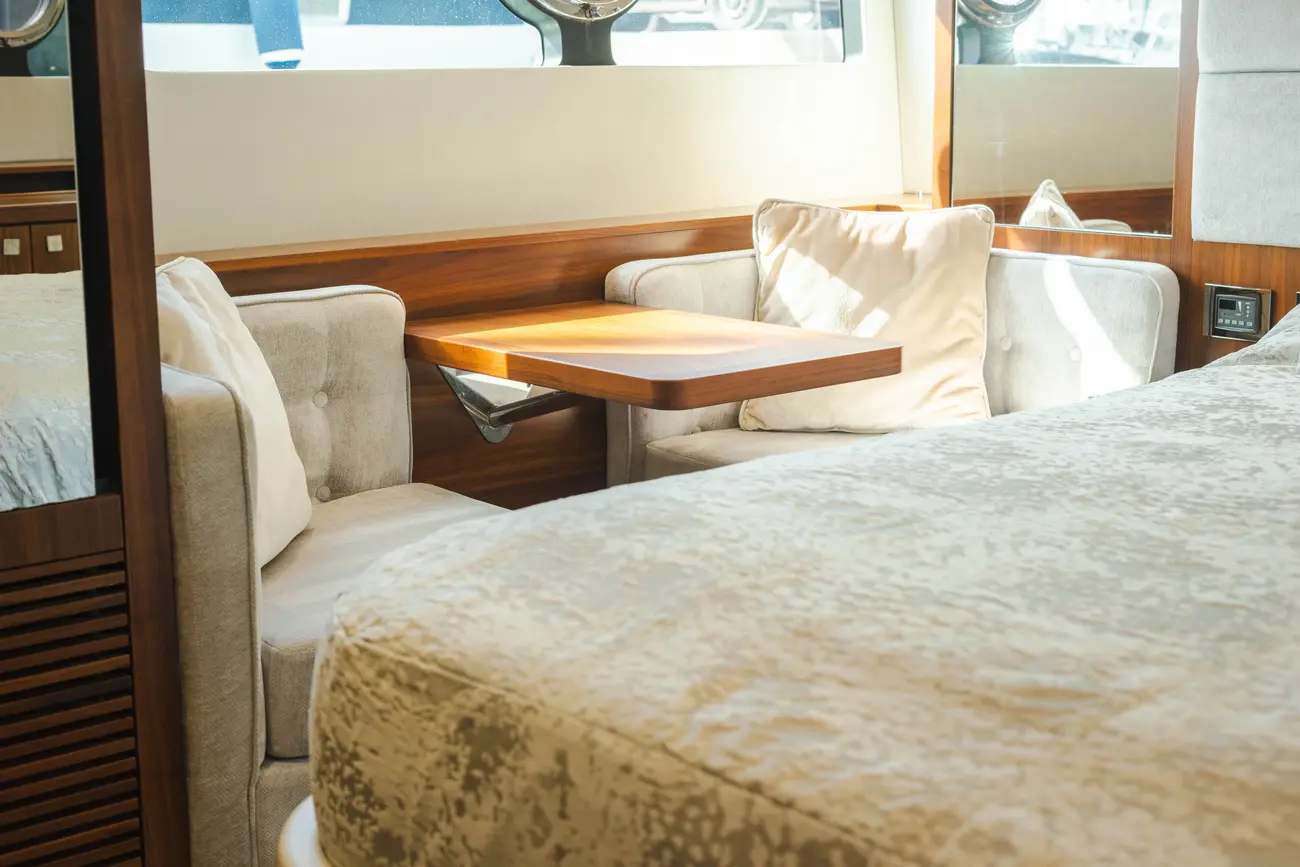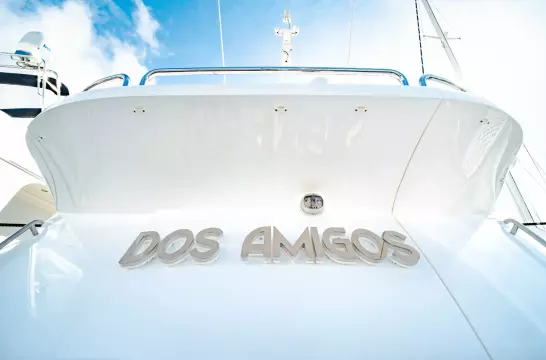 Powered by twin 900 HP engines with low hours, DOS AMIGOS delivers powerful yet smooth cruising. Equipped with bow and stern thrusters, generator, air conditioning, and comprehensive navigation electronics, she’s built for easy handling and serious enjoyment. Safety features include a fire suppression system and life raft.