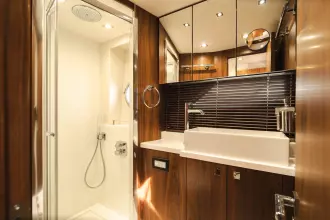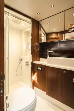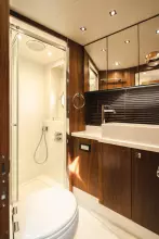 The Predator’s open cockpit layout boasts twin seating areas, expansive sun pads, and teak decking throughout. The hydraulic bathing platform and tender garage provide easy access to water toys, while the electric hardtop and gangway add to the effortless onboard experience. Sleek lines and underwater lighting enhance her striking presence.
