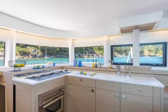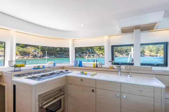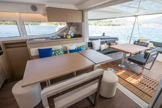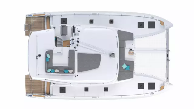 Above all, it’s designed for discerning sailors who want a boat that is elegant, practical and remarkably well thought out. An evolution of the Lagoon 42 – and so much more. With its forward-set mast, overlapping genoa and sleek lines, the Lagoon 43 offers a refined, contemporary look. The raised helm station to port – positioned on a half-deck – ensures safety, visibility and social connection. And let’s not forget the beautiful flybridge, complete with a cozy lounge – the perfect spot to unwind under the open sky.