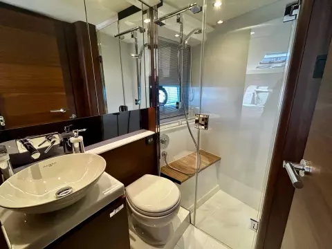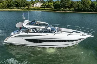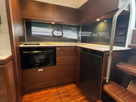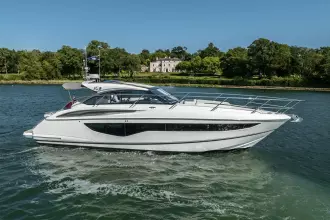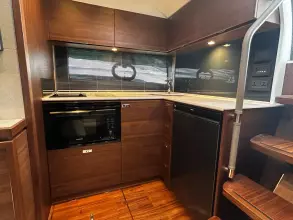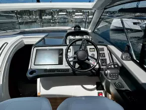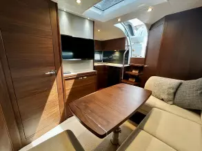 Twin Volvo D6-340DP (2x 340mhp diesel engines) • 2 Cabins accommodating 4 guests • White hull • Walnut interior wood satin finish • Electro hydraulic transom platform • Low level LED cockpit and bathing platform lighting • Aft seat extension • Full height cockpit cover • Raymarine navigation equipment • Volvo Joystick control • Bow thruster • Auto Pilot • Whisperpower 8 6.4kW Generator • Reverse cycle air-conditioning/heating • Saloon TV and audio package
