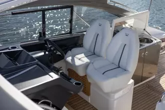 - Helm and cockpit seating is in white marine vinyl with Met Sterling contrast detail to helm seat plinth,