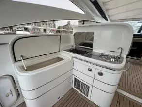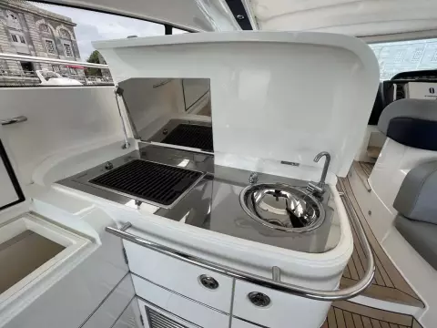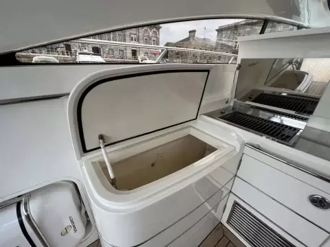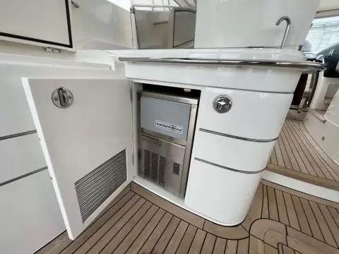 - Starboard side is the wet bar with top loading cooler, sink, bbq grill, and integrated ice maker