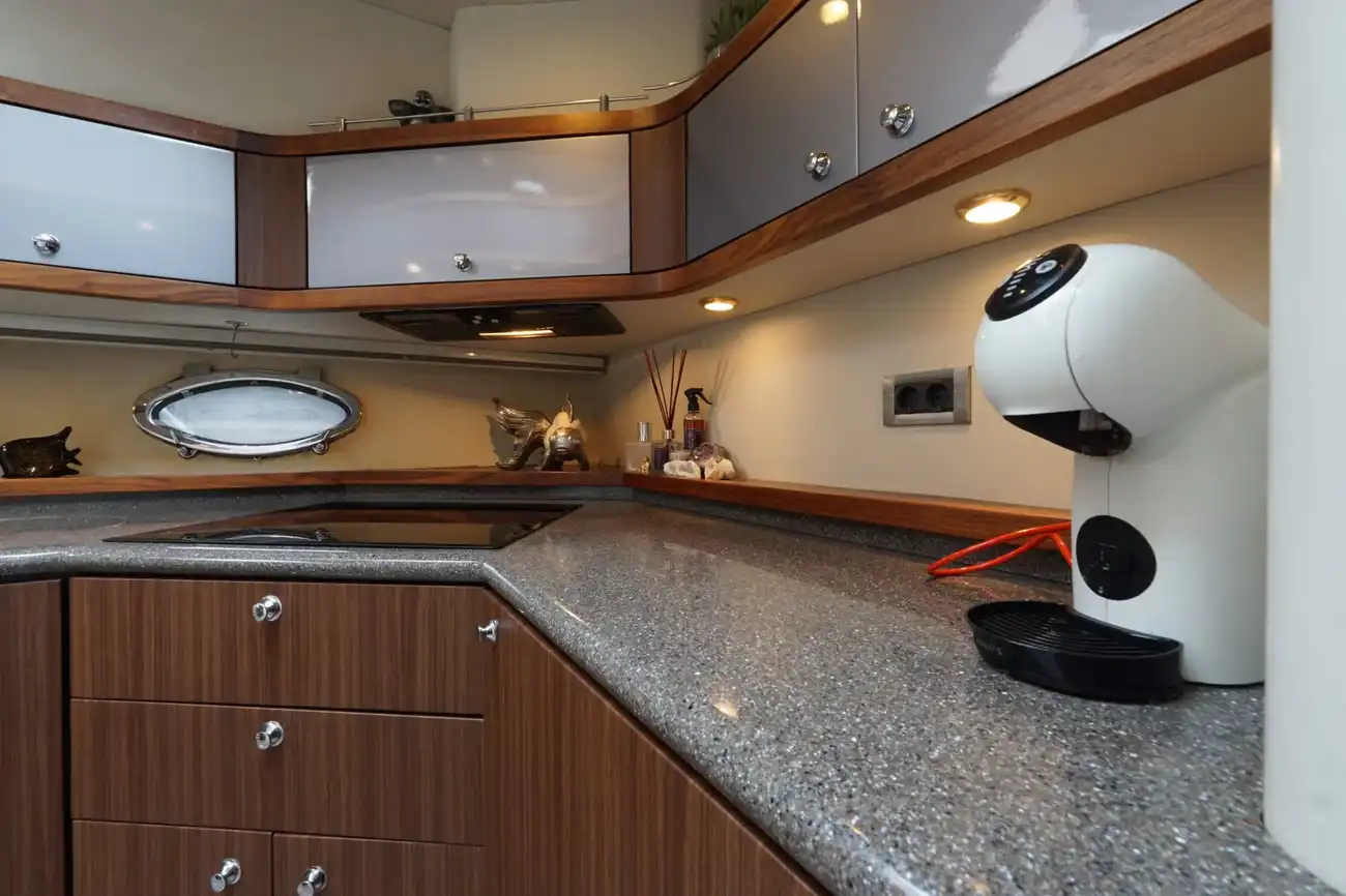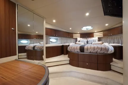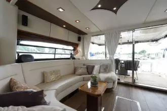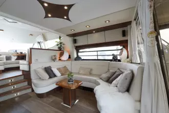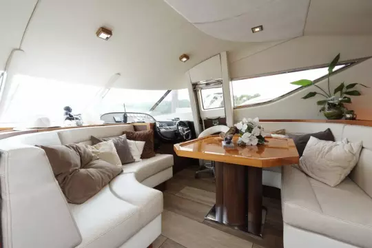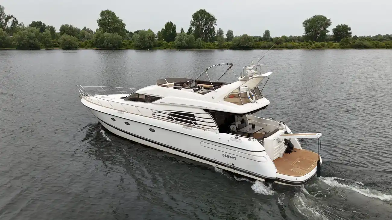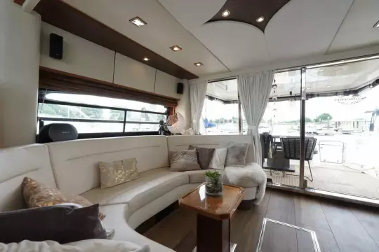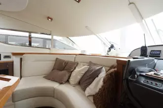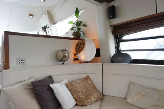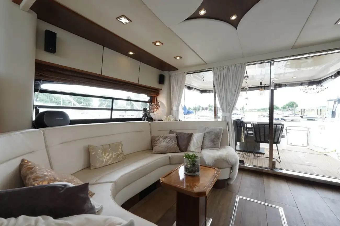 Perfect onderhouden met moderne uitstraling ingerichte Sunseeker Manhattan 62 met grote kuip met nieuwe bekleding op de banken, flexiteak in kuip en op zwemplateau.