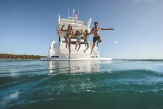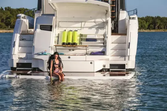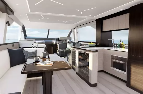Built upon the exceptional family of award-winning Manhattan models, the Manhattan 68 offers an extraordinary level of comfort and luxury with incredible detailing. Throughout the main deck, there is a strong focus on creating generous, usable sociable spaces. The exterior lines flow effortlessly from the Portuguese-bridge bow seating and sunbathing areas to the expansive cockpit adjoining an innovative Beach Club with enhanced features, including a dedicated water level locker with built-in charging for two SeaBobs, delivering effortless enjoyment. Internally, the expansive main saloon benefits from sweeping glazing, extending below the TV console, revealing glimpses of the sea from all perspectives. The fully-equipped aft galley with a large dinette links seamlessly to the cockpit via full-width sliding doors, helping to bring everyone together. The innovative design layout allows owners to welcome guests with a strong focus on ambient lighting and interior detailing. Access to the spacious guest cabins is via the lower helm and elevated companion seating, whilst the sumptuous master cabin amidships is accessed via its very own staircase to port. This exceptional layout allows the owner and guests to move effortlessly between spaces. The interiors boast exquisite attention to detail with a new palate of upholstery that provides a cool, crisp, and contemporary look, unmistakably a Manhattan. The special edition Manhattan 68 Pacific option features a newly configured saloon layout with double over-sized U-shaped sofas on the main deck to maximise entertaining space on board. Below deck, owners can expect a continuation of this yacht’s meticulous design. The Pacific arrangement offers an exceptional amount of space for a boat of this size. The master cabin affords owners with flexibility to use their private space however they wish. Portside, owners can opt for a chaise lounge, breakfast table and seating, vanity table with additional draws, or an equipped sideboard for ample storage. What’s more, the master cabin benefits from its own private lounge and bar, providing a relaxing retreat for owners. This exceptional layout strikes a perfect balance between ample social spaces for entertaining and generous private quarters.