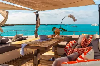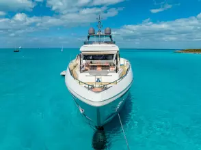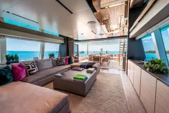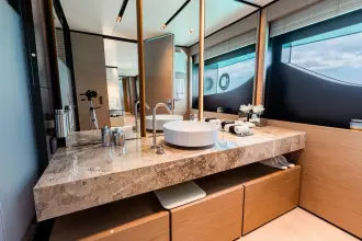 The Navetta 33 is the most popular model in the Custom Line series, sleeping up to 11 guests in 5 cabins (Pulman berth in a lower cabin), including a spacious on-deck master suite & crew accommodations for 7 with the captain’s cabin located on the upper deck. Highlights include a fold-down balcony off of the main salon for a great view and alfresco feel, a tender garage that houses a large assortment of watersports toys, a fantastic lounge area on the bow, a sundeck with a full-service bar under the hard top & jacuzzi, and my favorite space onboard, the sky lounge – a large U-shaped lounge area great for watching a movie or a place to relax.