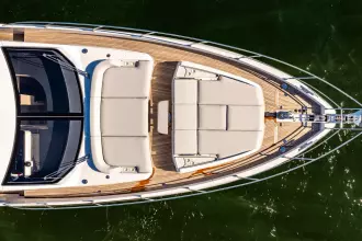 • Convenient Onboard Amenities: This vessel is an entertainer's dream, featuring a Cockpit Furniture with Icemaker & Sink, a Refrigerator, and a Sunshade Sail on the bow. The Foredeck Lounge with a convertible bench/sunbed and Corian lateral trays provides the perfect spot for relaxing in the sun.