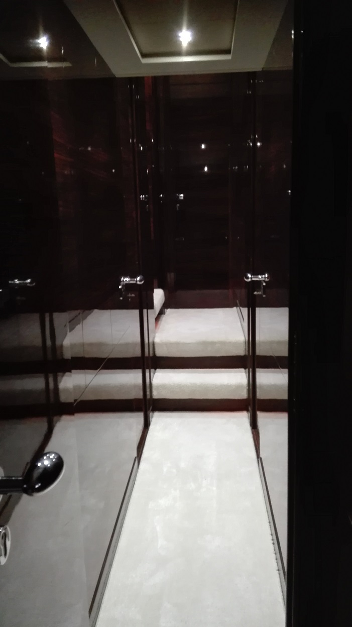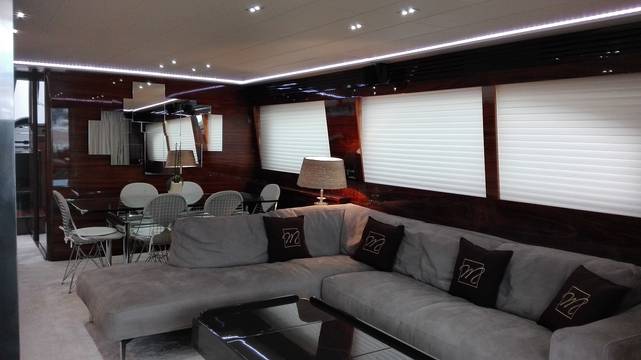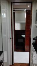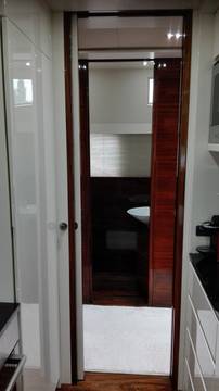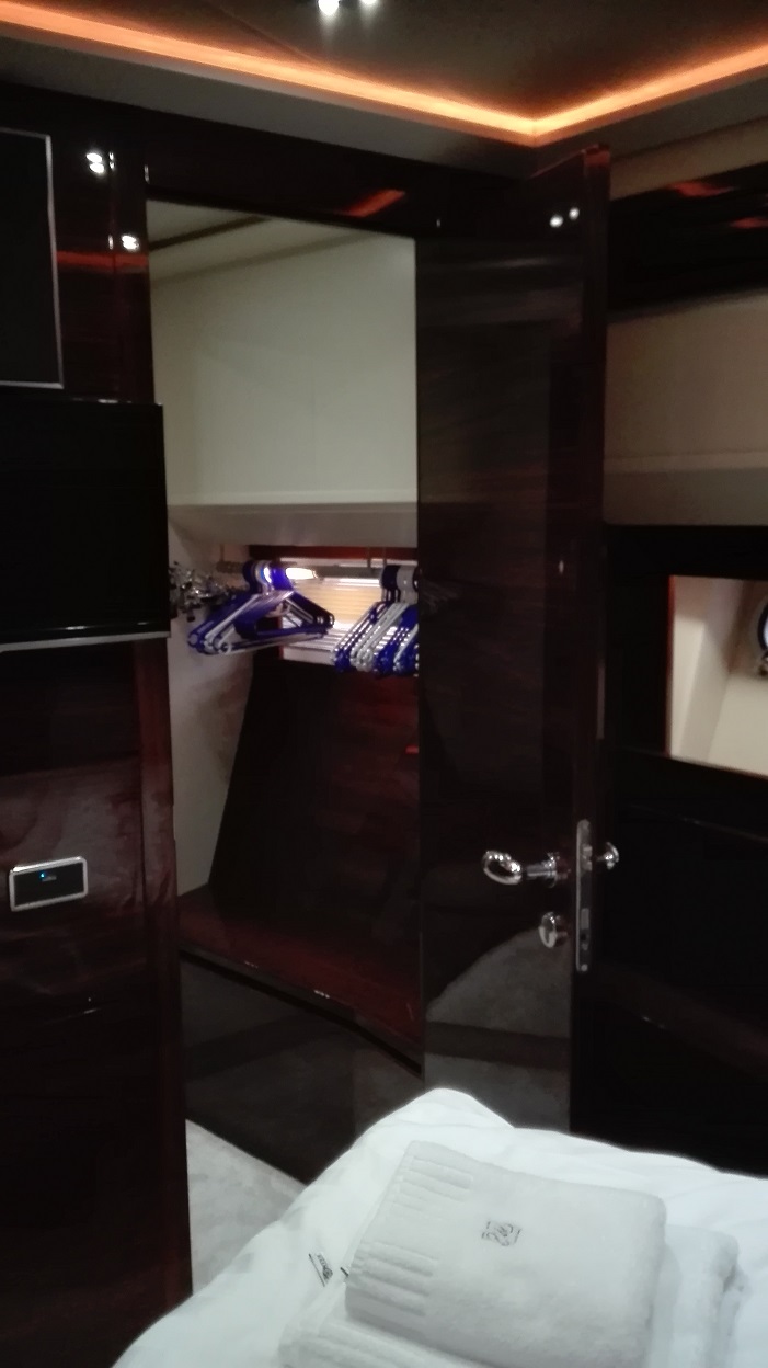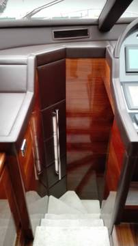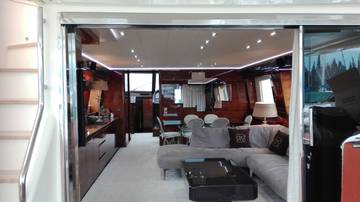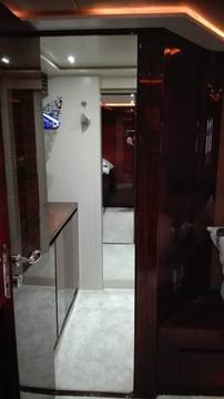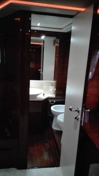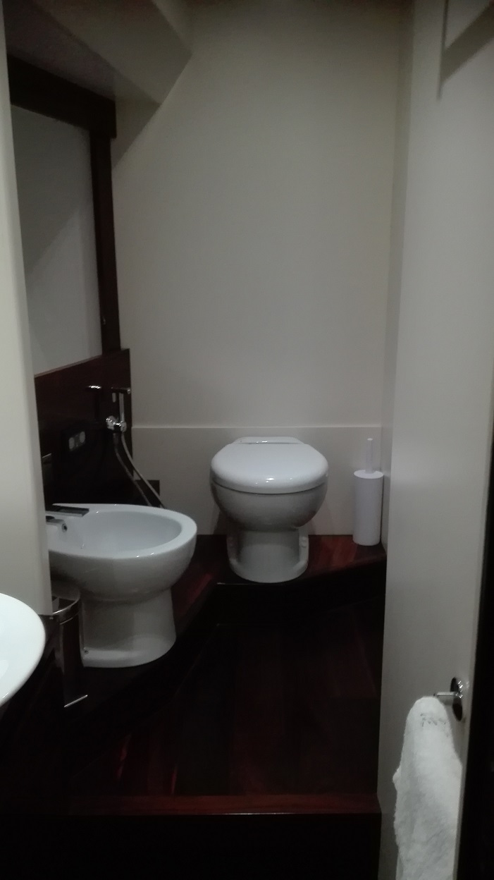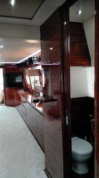 glass ceramic cook top, dishwasher, toilet electric, separate crew cabine, owner cabin, guest cabin, bow cabin, salon, head, steering position inside, steering position on flybridge, shore supply 220V, main circuit breaker, radio, suncushion, pressurized water system, warm water system, bathing platform integrated, transom door to bathing platform, teak deck, wetbar, cockpit table, bathing ladder, 220V plugs, underwater paint, holding tank, anchor windlass bow electric, searchlight, gangway electric, trim tabs, electric/hydraulic, stern shower warm/could