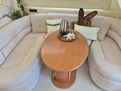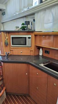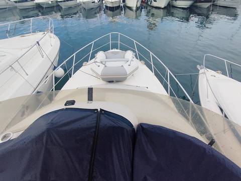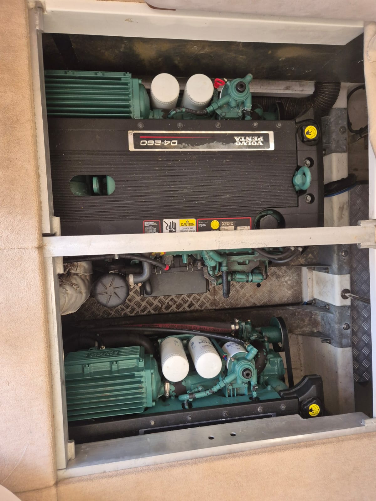 glass ceramic cook top, toilet electric, owner cabin, guest cabin, salon, head, steering position on quarterdeck, steering position on flybridge, fire extinguisher system, shore supply 220V, radio, TV antenna, cockpit cover, winter cover, suncushion, pressurized water system, warm water system, bathing platform integrated, cockpit table, bathing ladder, 220V plugs, underwater paint, engine battery, voltmeter, anchor windlass bow electric, windscreen wiper, searchlight, gangway electric, trim tabs, electric/hydraulic, stern shower warm/could, dinghy