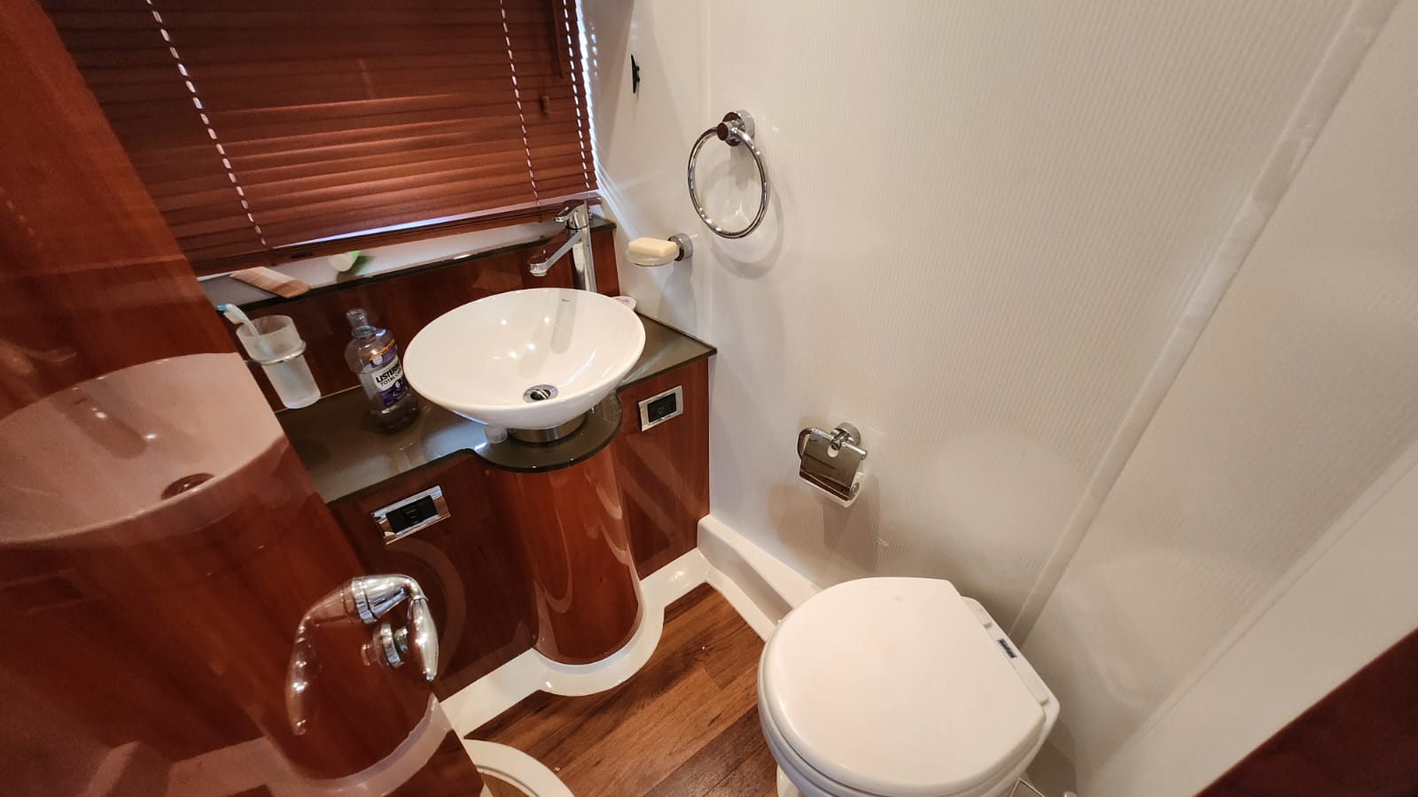 2nd refrigerator, glass ceramic cook top, dishwasher, washing machine, toilet electric, owner cabin, guest cabin, bow cabin, salon, head, steering position inside, steering position on flybridge, shore supply 220V, main circuit breaker, radio, pressurized water system, warm water system, transom door to bathing platform, cockpit table, bathing ladder, underwater paint, holding tank, anchor windlass bow electric, searchlight, bathing platform hydraulic, gangway electric, trim tabs, electric/hydraulic, stern shower warm/could