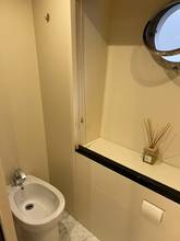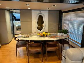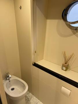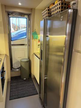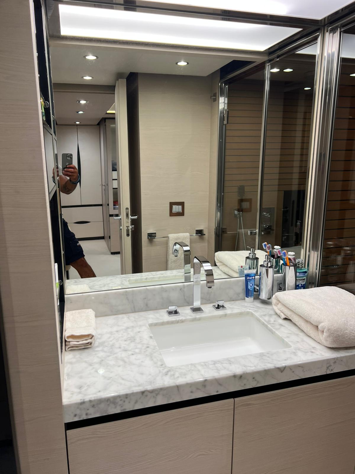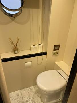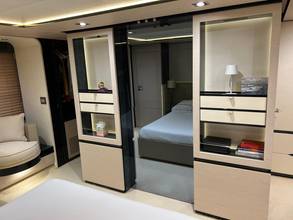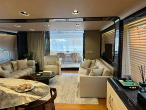 2nd refrigerator, extractor hood, glass ceramic cook top, dishwasher, icemaker, watermaker, on-board computer, toilet electric, separate crew cabine, owner cabin, guest cabin, bow cabin, salon, head, steering position inside, steering position on flybridge, fire extinguisher system, shore supply 220V, main circuit breaker, radio, TV antenna, cockpit cover, sun shade / aftdeck, suncushion, warm water system, transom door to bathing platform, teak deck, cockpit table, bathing ladder, jacuzzi, underwater paint, holding tank, anchor windlass bow electric, anchor windlass stern electric, search light remote controlled, bathing platform hydraulic, gangway electric, trim tabs, electric/hydraulic, stern shower warm/could
