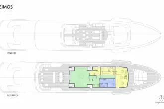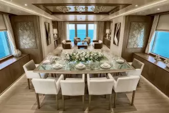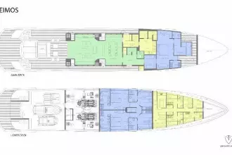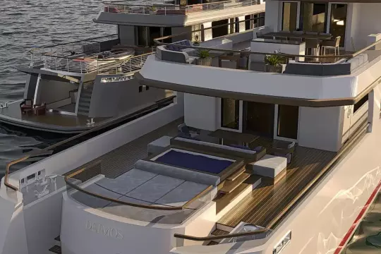 DEIMOS is a glamorous navetta style, featuring an additional aft pool on the main deck. Inside, the yacht accommodates up to twelve guests across six spacious cabins. The Owner’s suite, measuring over thirty seven square meters, includes a twelve-square-meter private terrace with panoramic views to both port and starboard—an exceptionally rare feature on a yacht of this size.