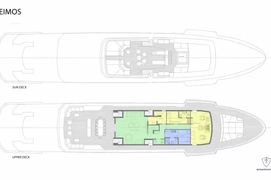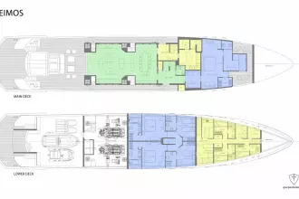 Crew spaces are designed with guest privacy and service efficiency in mind, including three double cabins forward and a dedicated captain’s cabin adjacent to the wheelhouse. Generous storage and technical areas ensure that DEIMOS is prepared for extended cruising and exploration.