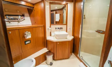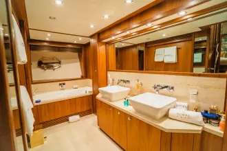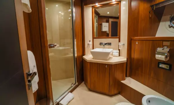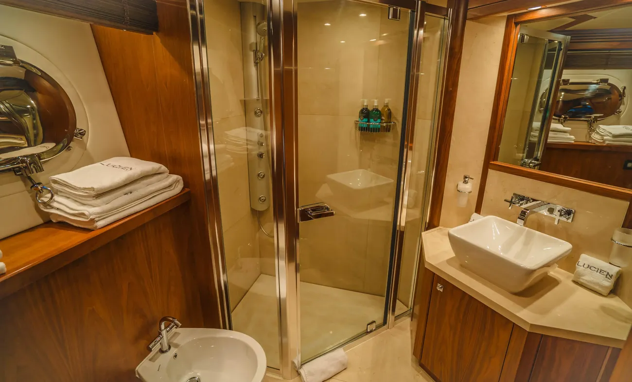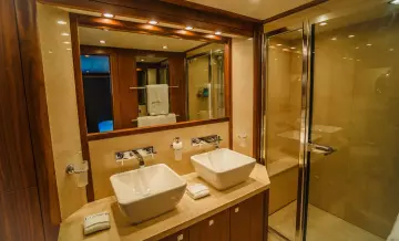 The port and starboard aft VIP cabins include double sinks in the ensuite, massage shower, Techma toilet and bidet.