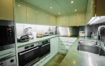 Dumbwaiter, coffee machine, stainless steel sink with mixer, pantry storage, Full size Miele fridge, Composite marble top, stainless steel splash backs, excellent storage and window. Icemaker