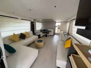 - Lounge furniture on aft fly with two love seats in Olimpus simil leather and two coffee tables (specify if teak table or table with corian frame and synthetic marble insert)