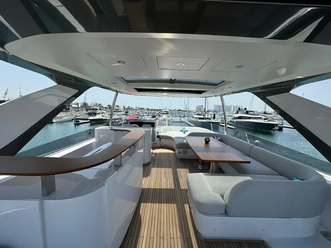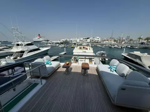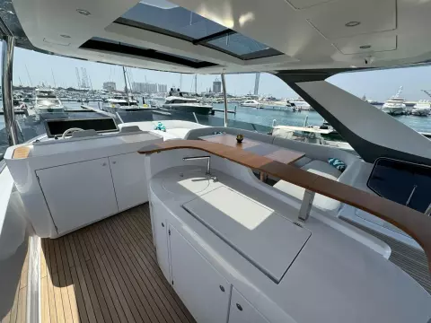 - Lounge furniture on aft fly with one long seat opposite to a short one in Batyline fabric (specify code) and two coffee tables (specify if teak table or table with corian frame and synthetic marble insert) (not compatible with additional storage on flybridge)