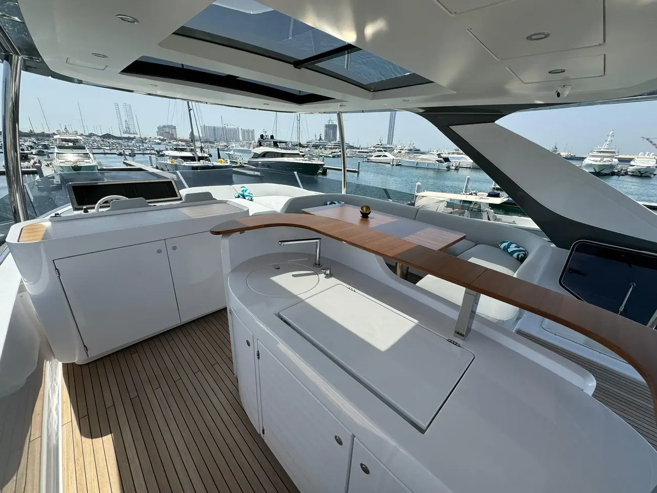 - Flybridge furniture with 43'' TV and lift (Specify if teak top or top with corian frame and synthetic marble insert)