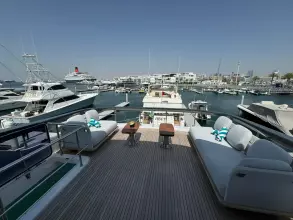 - Lounge furniture on aft fly with one long seat opposite to a short one in Olimpus simil leather and two coffee tables (specify if teak table or table with corian frame and synthetic marble insert) (not compatible with additional storage on flybridge)