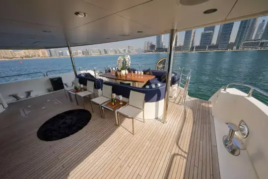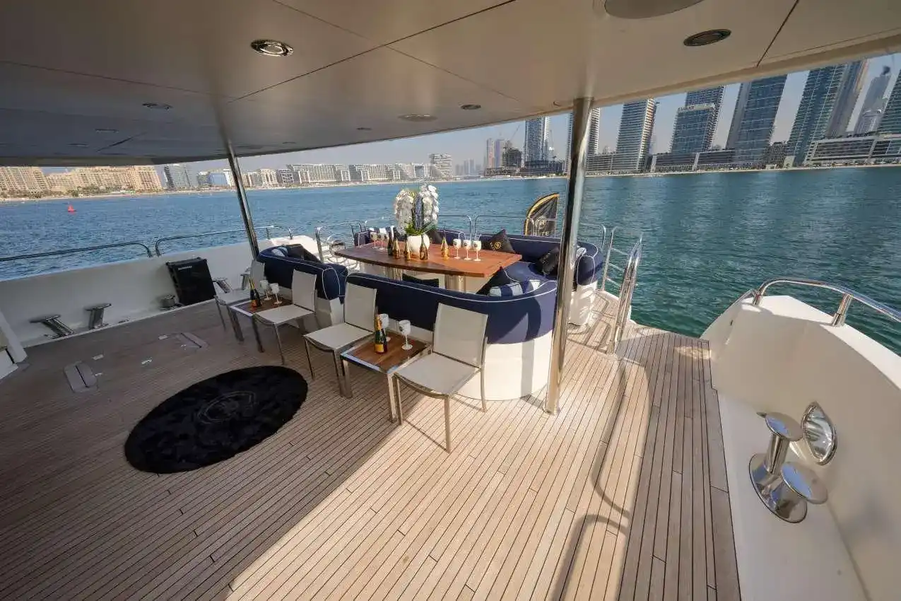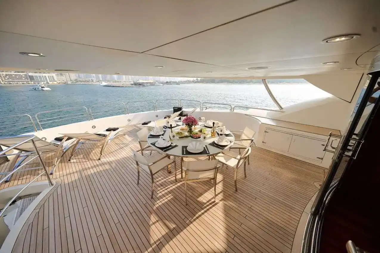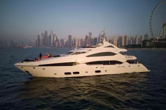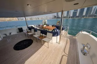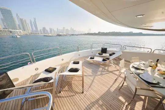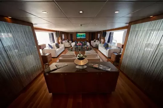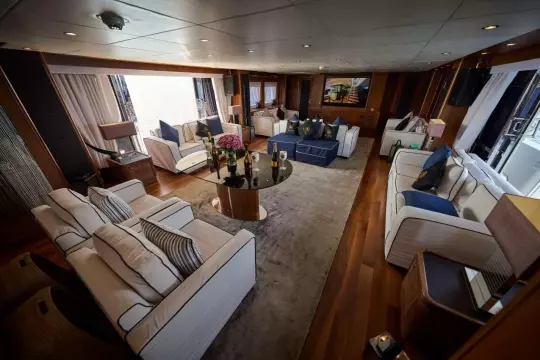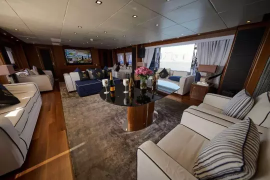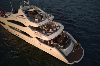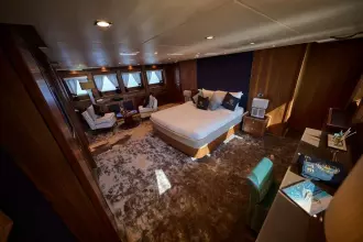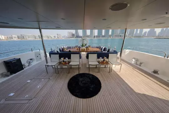 Step aboard the 131 Yacht and you’re greeted by three expansive decks designed for both grand entertaining and intimate retreats. The sky deck boasts a sunken jacuzzi and wet bar, perfect for sunset gatherings. Just below, sliding doors open the upper salon to a shaded lounge and elegant dining area. On the main deck, a professionally equipped galley and wrap-around seating flow seamlessly into al fresco dining on the aft deck.