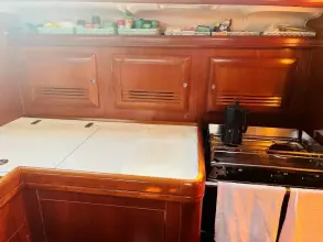 To starboard is Apoena´s large L-shaped galley. Wide Corian countertops with teak fiddles allow for extravagant preparations in this well-conceived space. At the forward inboard end is a deep two bin stainless sink set below the countertop. A glass splash guard divides the forward end of the sink from the settee. Below the inboard end of the counter are two drawers and a large locker. Aft below the inboard leg of the counter are a narrow locker with spice rack and bottle storage, and a large hinged trash locker beneath the sink. The top loading freezer and front loading fridge are located at the forward end of the counter along the hull side. Just aft is the two burner stove/oven with stainless crash bar. There is a locker for pots and pans beneath the stove. Aft of the stove is a large counter space with a locker with shelves below.