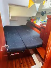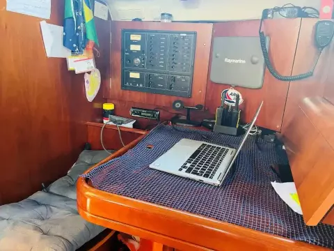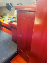 Aft and to port in the salon is the forward-facing navigation station. There is a large chart table with lifting top and a small fiddle. The Raymarine radar/chartplotter, sailing instrument multi display, VHF radio, battery monitor, electrical panel are close at hand. There is a chart spotlight and red night light. A curved molded navigator’s seat provides a comfortable perch whether under sail or at anchor. There is a storage bin below this navigator’s seat that houses the inverter/charger, outboard in a deep shelf and above the electrical panel. Additional storage is available in a drawer and locker below the forward end of the table.