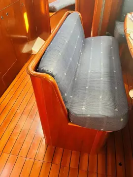 The spacious salon is next aft. To starboard is a large U-shaped dinette with a fixed table. A bench on centerline provides seating for the inboard end of the table – this arrangement allows for at least eight guests around the table. There is an additional armchair with a large closet along the port side of the cabin. All seats are upholstered in timeless blue fabric. Storage is nicely configured in the salon with shelves and lockers above and outboard of the settees to port and starboard. There is additional storage space outboard of the settee seatbacks and beneath the centerline bench. Fixed ports in the hull sides and cabin provide light and a view to the outside from a seated position and headroom in this space is 6’ 7”.