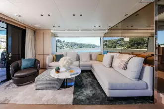 SX76 #32 is powered by twin Volvo IPS1200 900hp engines (565 hours), delivering efficient cruising, a top speed of 22 knots, and a range of approximately 615 NM at 11 knots. Factory upgrades include CMC fin stabilisers, an additional generator, water maker, Volvo Docking Station in Cockpit, Digital Positioning System and a Williams 395 Jet Tender (69 hours) to name only a few.