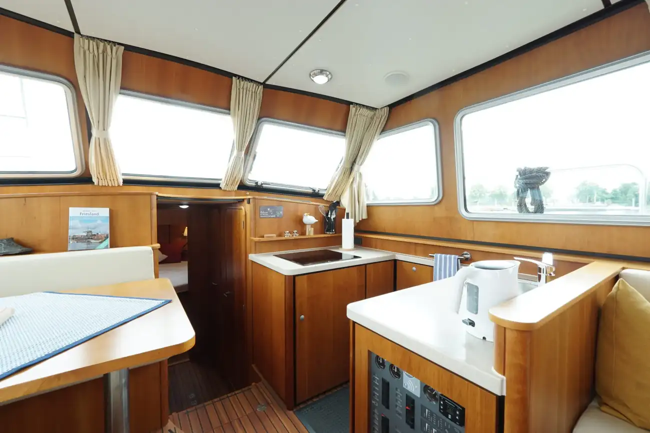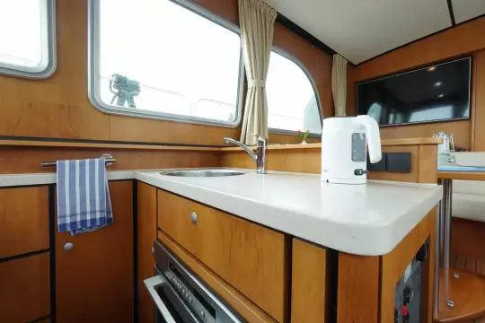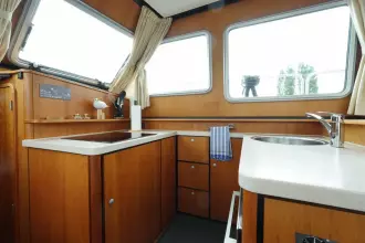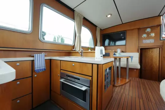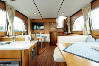 Inside, you will find a cozy interior with solid cherry wood, recently renewed upholstery (2023), and a modern galley equipped with: