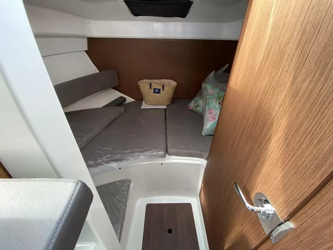 double cabin below the wheelhouse at the bow of the boat, with storage and a shower en suite, so you can stay on board