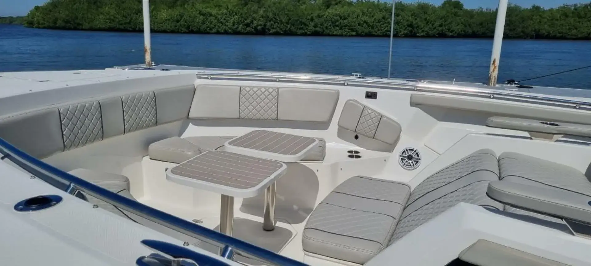 - Molded Forward Bow Seating with Insulated Storage Below, Electric-Actuating Hinged Forward Facing Backrests for Port and Starboard Seats with Clear Passage Forward