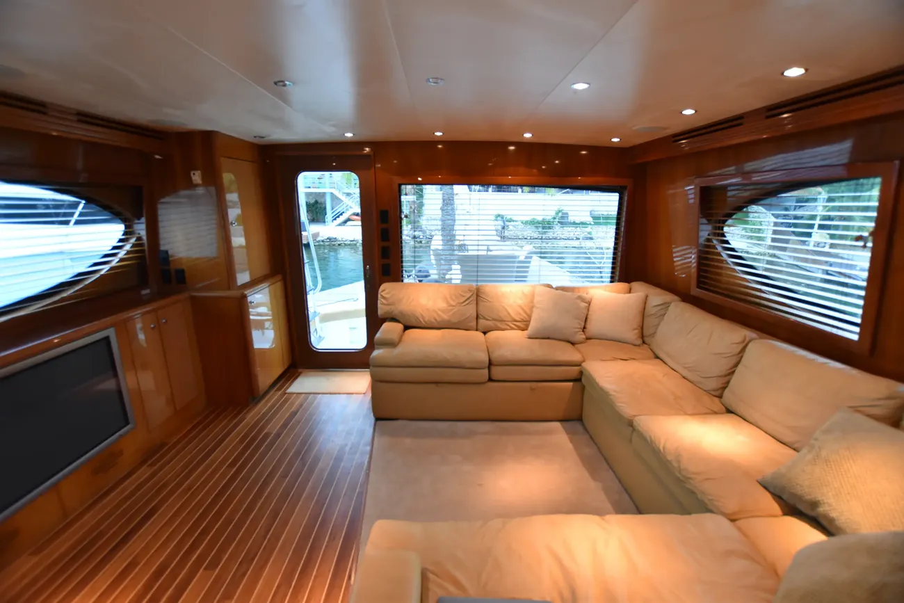 U-shaped sectional sofa to port, opposite a full-length cherry cabinet with built-in 42" TV.(Needs to be serviced) Whirlpool Icemaker starboard
