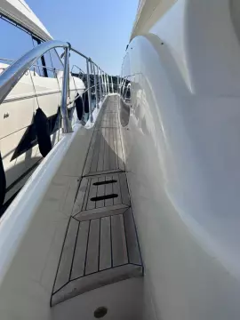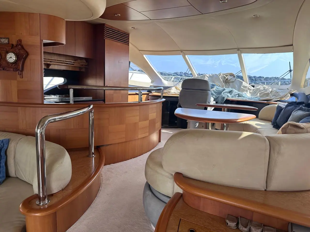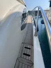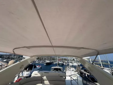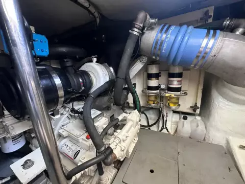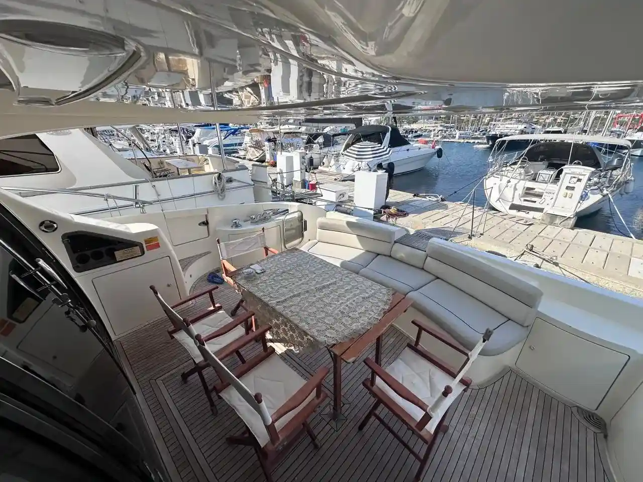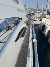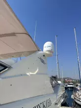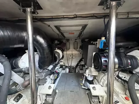 Exterior & Comfort: Large flybridge with sun pad, seating, dining, wet bar, and secondary helm with optional crane. Outdoor seating and dining, perfect for socializing in the aft-cockpit.