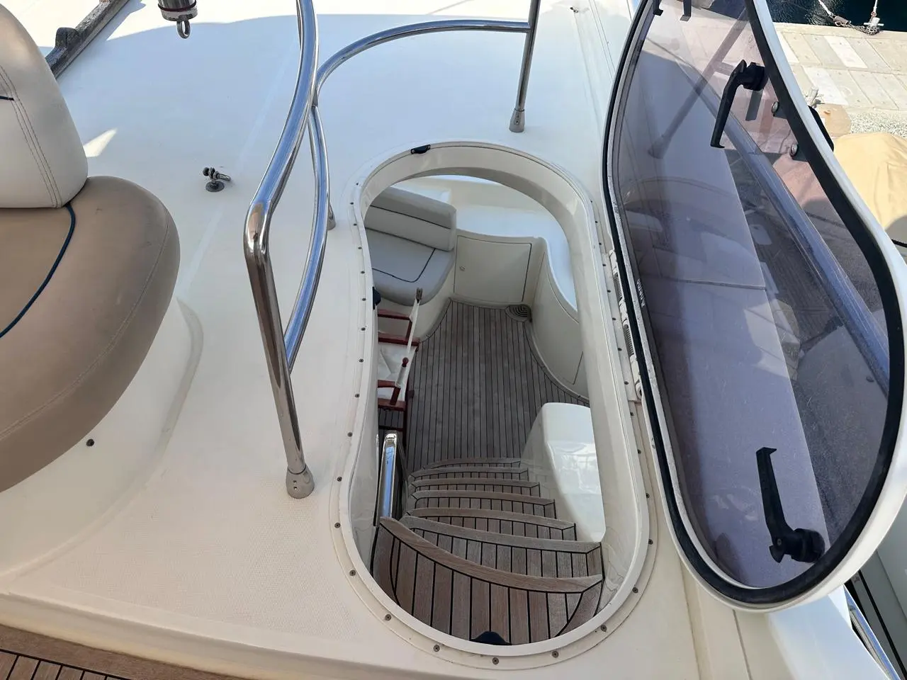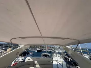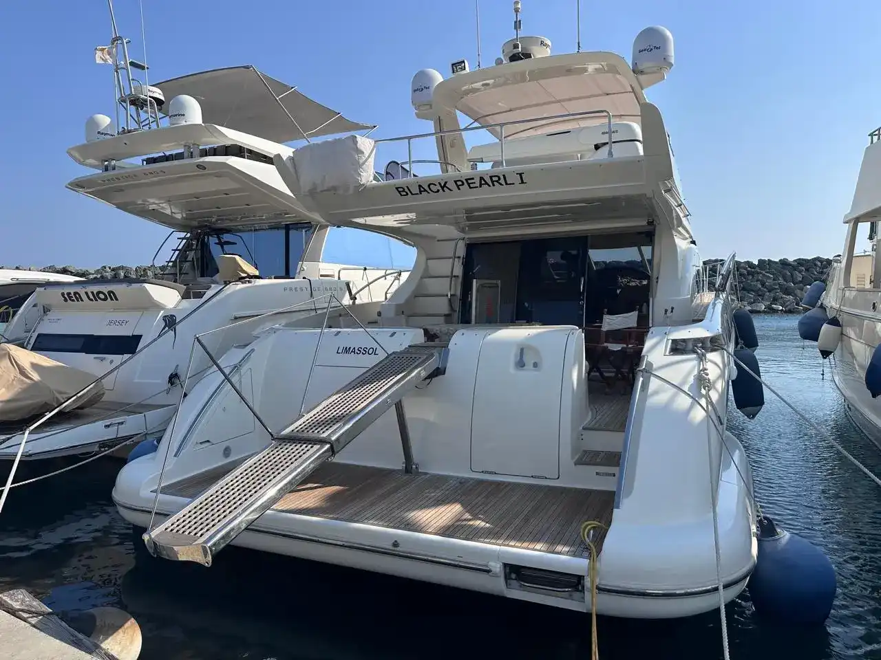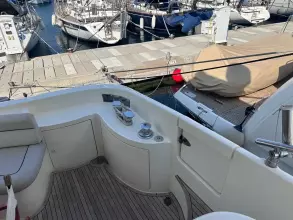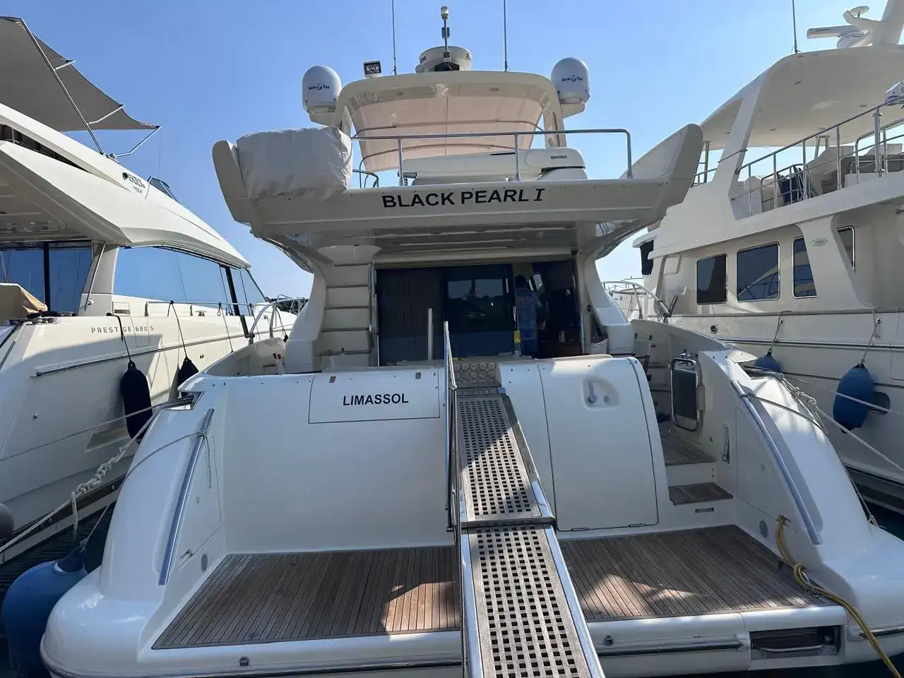 Exterior & Comfort: Large flybridge with sun pad, seating, dining, wet bar, and secondary helm with optional crane. Outdoor seating and dining, perfect for socializing in the aft-cockpit.