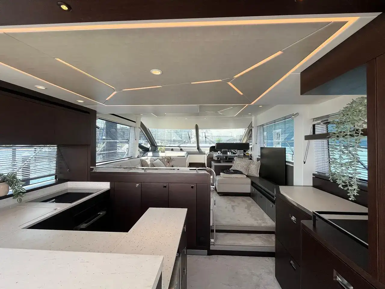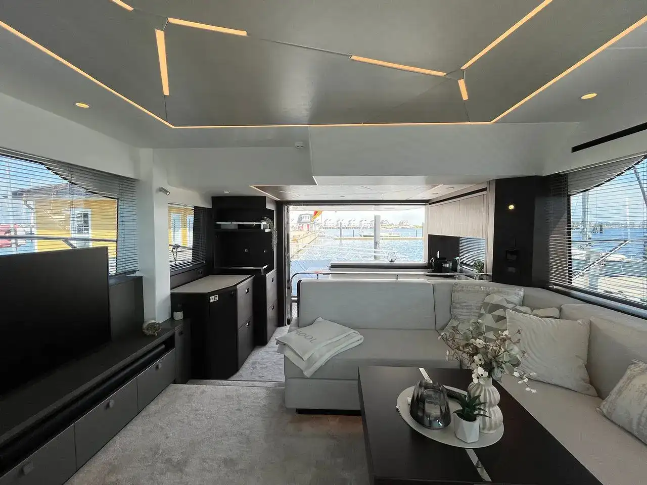 On the main deck, the aft galley layout allows for seamless service between the cockpit and the saloon, ideal for social gatherings. The saloon itself offers a large U-shaped seating area, a dining table, and an additional loveseat opposite – all framed by panoramic windows for stunning views and a bright, airy feel.