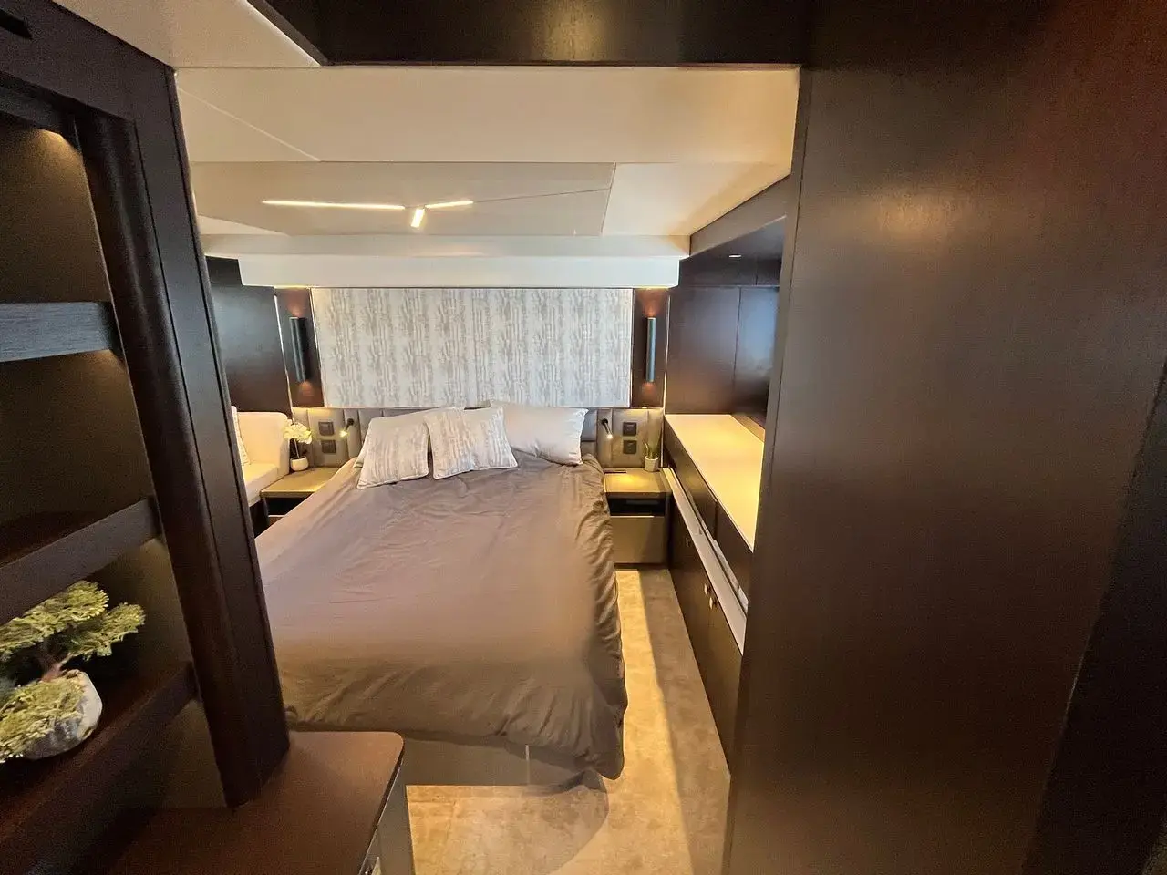 This yacht combines sleek design with intelligent use of space across three levels. The bright, open-plan saloon with its aft galley creates a welcoming social hub, while the spacious flybridge, featuring a wet bar, helm station, and sun loungers, is perfect for entertaining or relaxing at sea.