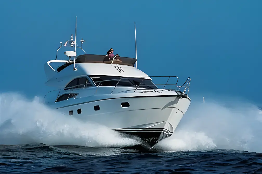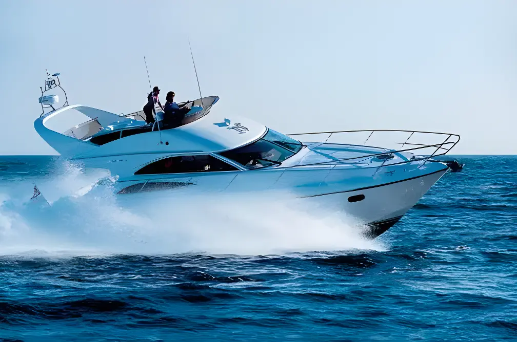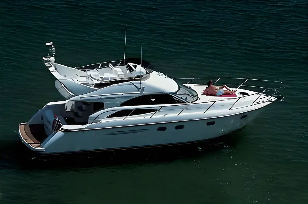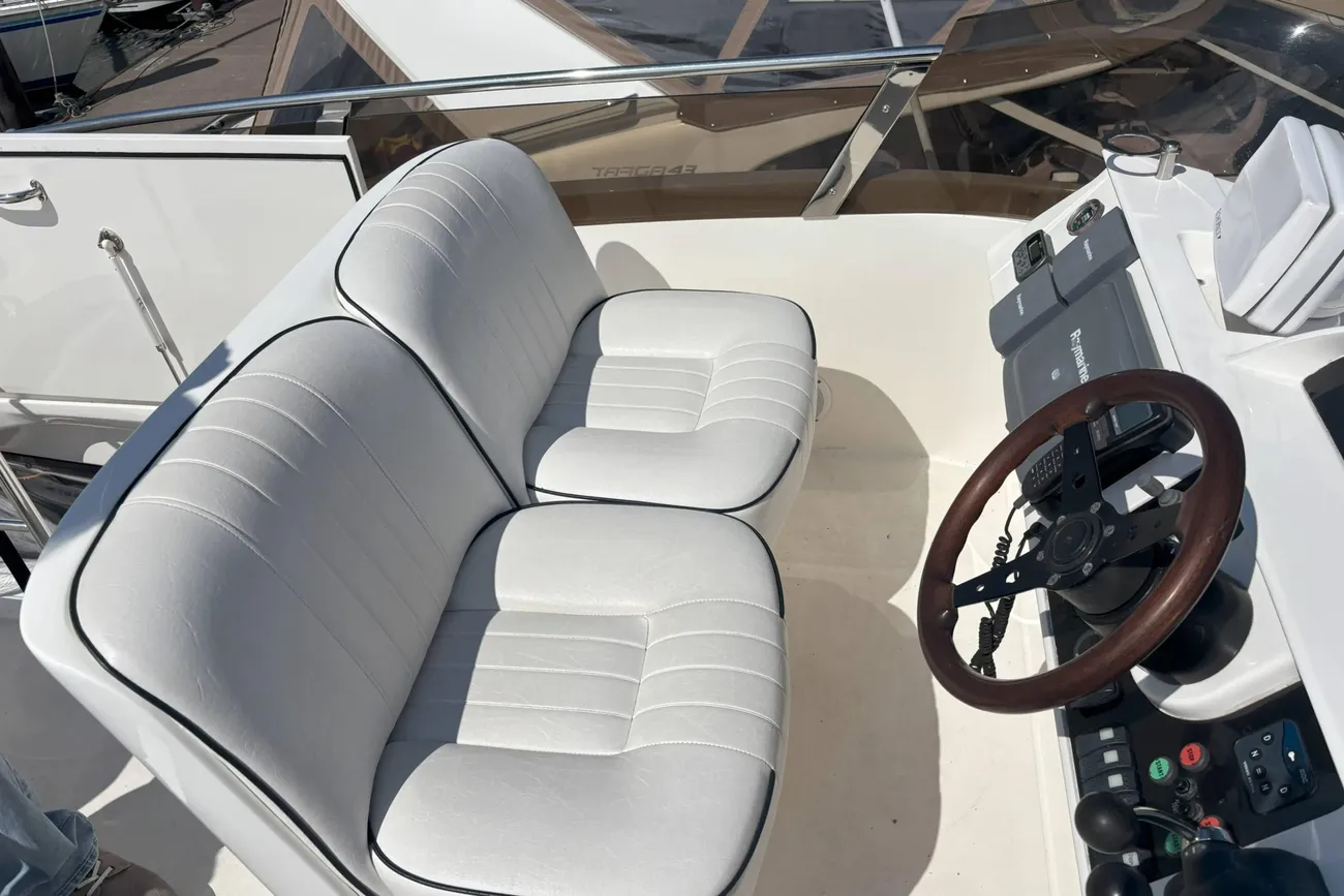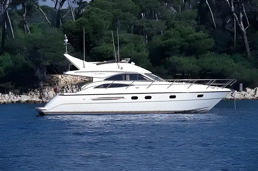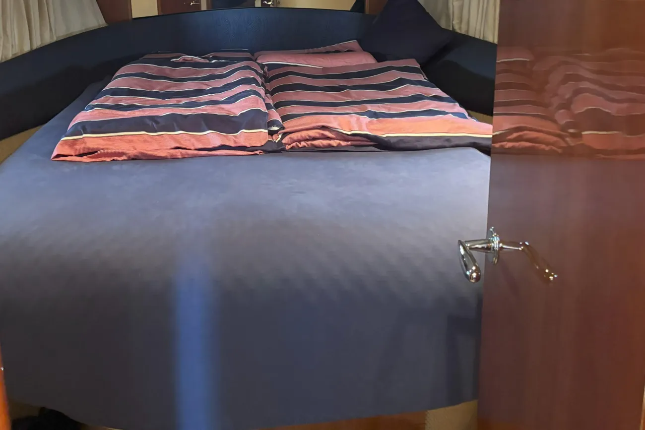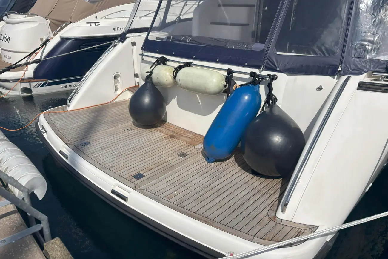 Year: 2004 Build, 2005 Model • EU Tax: Paid • Engines: Twin Volvo Penta TAMD 75P diesel engines • Hull Color: White with blue water line • Cabins: 3 cabins accommodating 6 guests • Equipment: VHF radio, Autopilot, GPS with repeater, Radar, Chartplotter, Integrated bathing platform, Electro-hydraulic trim tabs, Bow thruster, Diesel generator, 220V shore power, Fish finder, Pressurised water system, Additional refrigerators, Three burner gas stove, Microwave with grill function, Freezer, Searchlight, Television, Radio, CD Changer