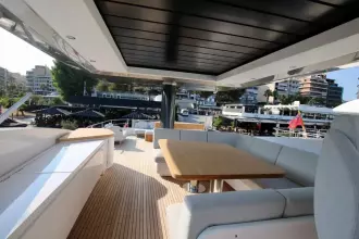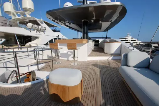 • N.2 coffee tables on bow convertible in sunbathing area (specify top material: dark teak, synthetic marble or green marble)