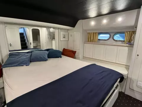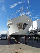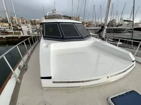 On deck there is a dining area in the cockpit, a sunpad on the bow, a crane with a tender and outboard, and a large seating area on the flybridge behind the helm station.